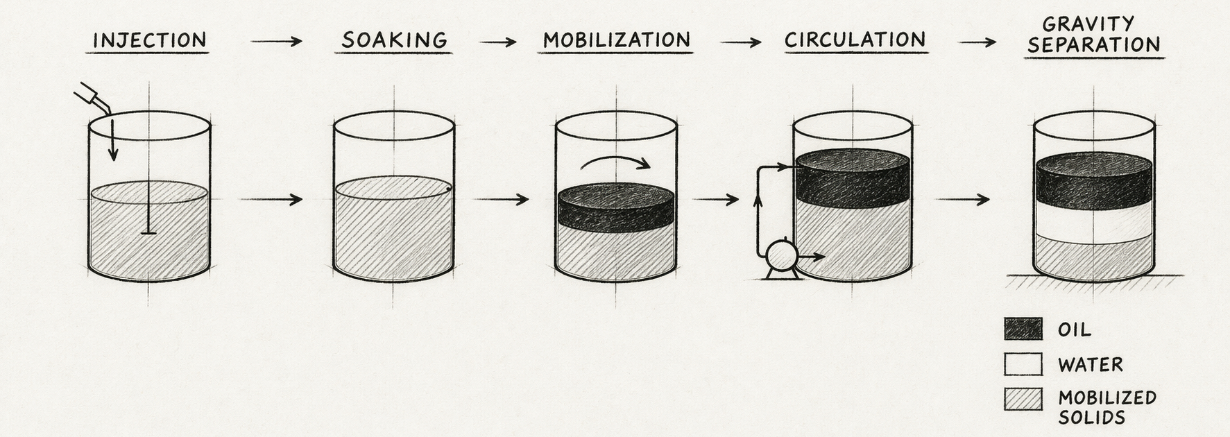 Conventional tank cleaning and sludge treatment typically rely on solvent dissolution, emulsification or mechanical removal.